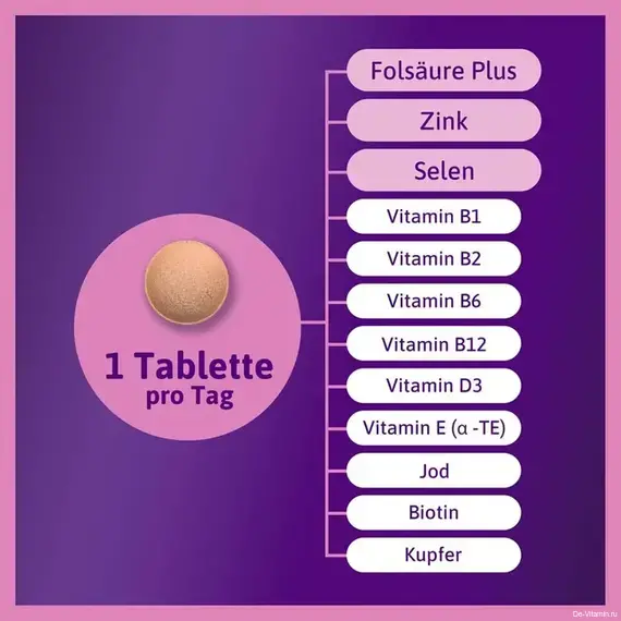Наполнитель: микрокристаллическая целлюлоза; Оксид цинка; мальтодекстрин; DL-α-токоферола ацетат; Разделительный агент: фосфаты кальция; Сахар; Эмульгатор: гуммиарабик; глюкозный сироп; Модифицированный крахмал; Покрывающий агент: гидроксипропилцеллюлоза; Сила; Покрывающий агент: гидроксипропилметилцеллюлоза; Наполнитель: сшитая карбоксиметилцеллюлоза; медный купорос; пиридоксина гидрохлорид; рибофлавин; тиамина мононитрат; Антислеживатель: магниевые соли жирных кислот; L-метилфолат кальция (Метафолин®); птероилмоноглутаминовая кислота; йодистый калий; селенат натрия; Краситель: оксиды и гидроксиды железа; D-биотин; холекальциферол; цианокобаламин.