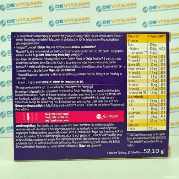 Продукты Femibion содержат фолиевую кислоту (фолиевая кислота и Метафолин®) и другие избранные питательные вещества; Фемибион® 2 и 3 также содержат докозагексаеновую кислоту (DHA). Дополнительный прием фолиевой кислоты увеличивает уровень фолиевой кислоты у беременных. Низкий уровень фолиевой кислоты у беременных является фактором риска развития дефектов нервной трубки у растущего плода. Для этого необходимо дополнительно принимать 400 мкг фолиевой кислоты ежедневно в течение как минимум одного месяца до и до трех месяцев после зачатия. Дефект нервной трубки связан с несколькими факторами риска. Изменение фактора риска может иметь или не иметь положительный эффект. Фолат способствует росту материнской ткани во время беременности, в том числе развитию плаценты.