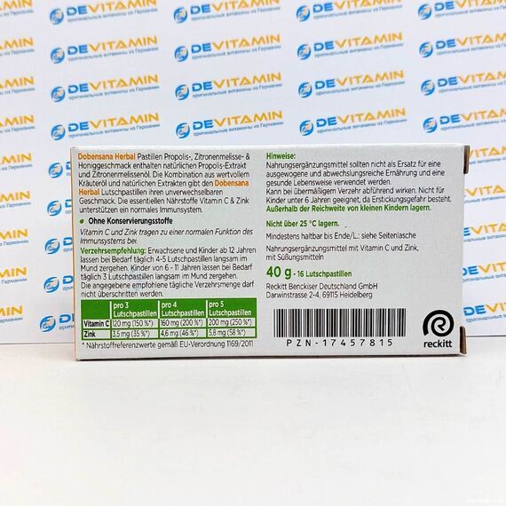 Reckitt Benckiser Deutschland GmbH Darwinstraße 2-4 69115 Heidelberg Deutschland, ГерманияХарактеристики Dobensana Herbal Добенсана с цинком и витамином С для иммунитета, 16 пастилок, Германия