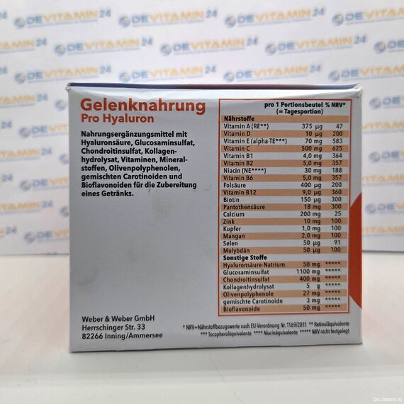 Weber & Weber GmbH & Co. KG Herrschinger Str. 33 82266 Inning/Ammersee, ГерманияХарактеристики Orthoexpert Gelenknahrung Pro Hyaluron Ортоэксперт комплекс при артритных изменениях суставов, 30 штук