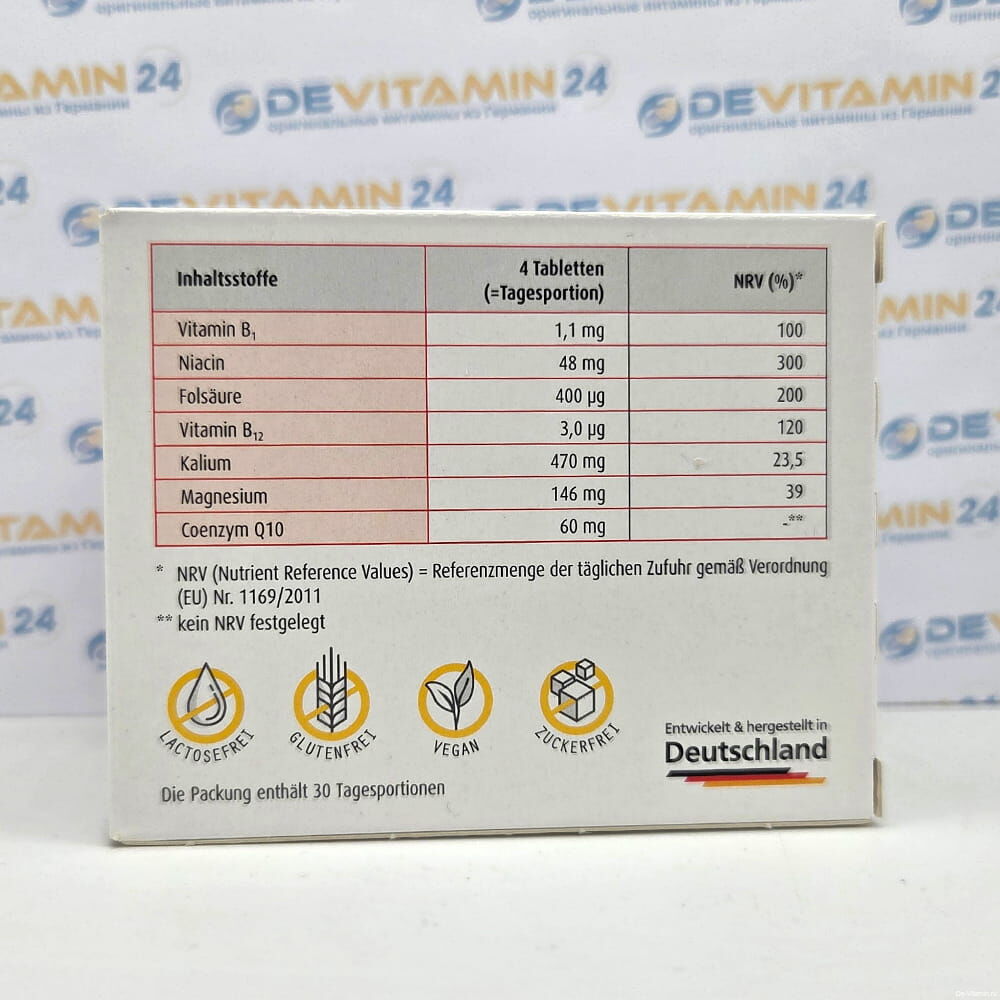 калием, магнием, фолиевой кислотой, витамином В12, ниацином и коэнзимом Q10 - 2 раза по 2 таблетки в день