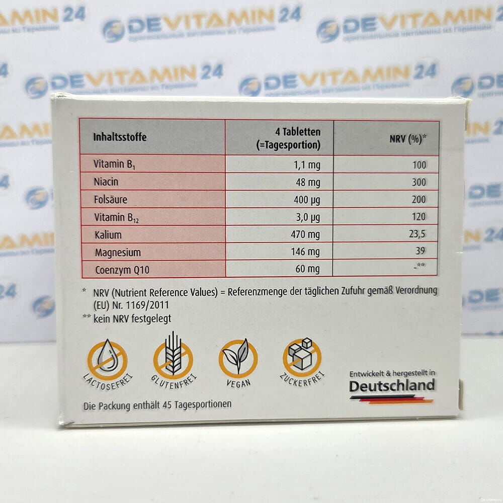 калием, магнием, фолиевой кислотой, витамином В12, ниацином и коэнзимом Q10 - 2 раза по 2 таблетки в день