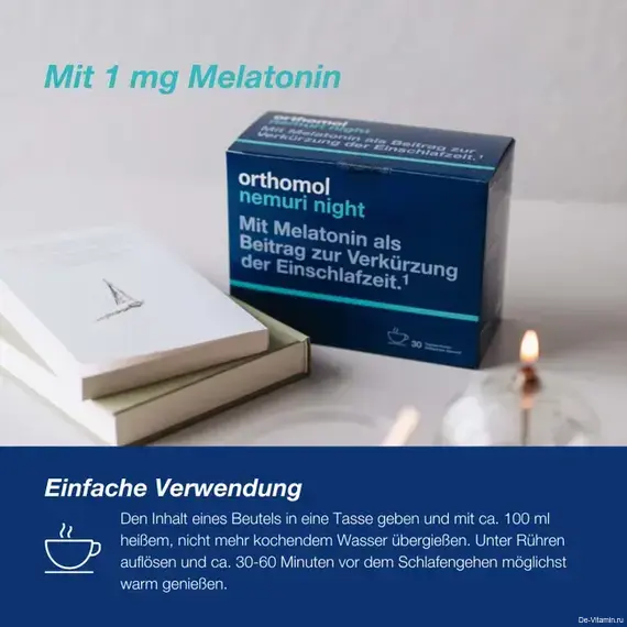 Приготовить этот успокаивающий горячий напиток очень просто: высыпьте содержимое одного пакетика в чашку и добавьте примерно 100 мл горячей, но не кипящей воды. Хорошо перемешайте до полного растворения порошка и наслаждайтесь тёплым напитком, желательно за 30–60 минут до сна. С восхитительным лимонно-мёдовым вкусом.