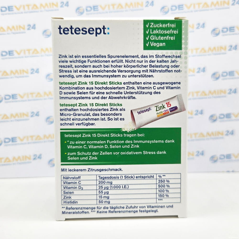 Merz Consumer Care GmbH Экенхаймер Ландштрассе 100, 60318 Франкфурт, ГерманияХарактеристики Tetesept Цинк 15 мкг, 20 стиков, Германия