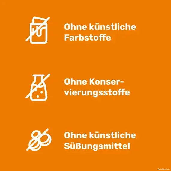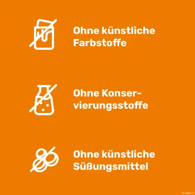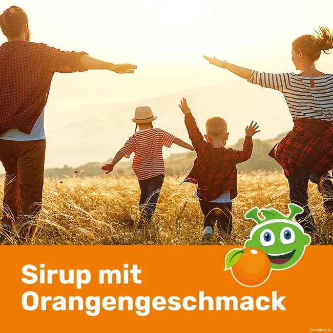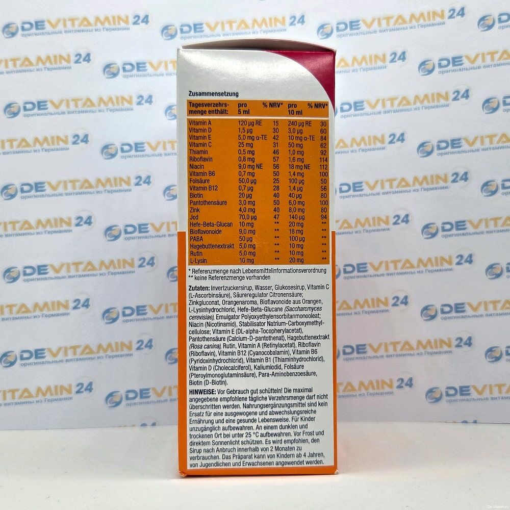 Инвертный сахарный сироп, вода, сироп глюкозы, L-аскорбиновая кислота, регулятор кислотности лимонная кислота, глюконат цинка, апельсиновый ароматизатор, биофлавоноиды из апельсинов, гидрохлорид L-лизина, бета-глюканы дрожжей (Saccharomyces cerevisiae), эмульгатор полиоксиэтиленсорбитанмоноолеат, никотинамид, стабилизатор натрия карбоксиметилцеллюлоза, DL-альфа-токоферилацетат, D-пантотенат кальция, экстракт шиповника (Rosa canina L.), рутин, ретинилацетат, рибофлавин, цианокобаламин, пиридоксина гидрохлорид, тиамина гидрохлорид, холекальциферол, йодид калия, птероилмоноглутаминовая кислота , парааминобензойная кислота, D-биотинСпособ приема: