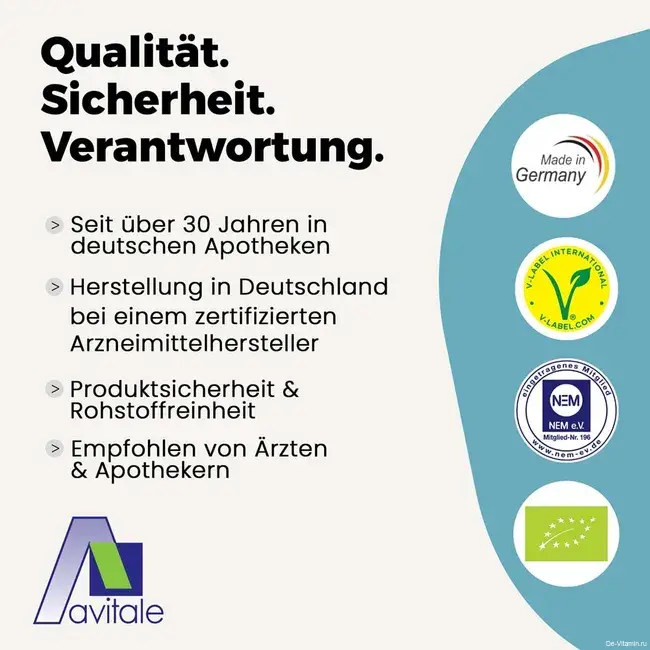 Avitale GmbH Butenring 7 25479 Ellerau, ГерманияХарактеристики Селен 200 мкг Avitale Selen, 60 таблеток, Германия