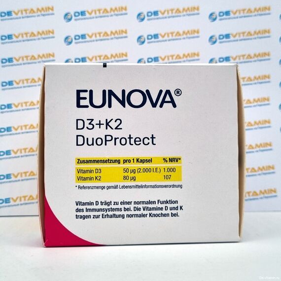 EUNOVA DuoProtect D3 + K2 сочетает витамины D3 и K2 в одной пищевой добавке. Таким образом, EUNOVA DuoProtect D3 + K2 вносит ценный вклад в ваш ежедневный рацион.
