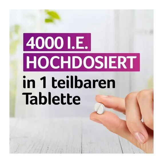 ВИГАНТОЛВИТ 4000 МЕ – это ежедневная пищевая добавка для взрослых в пожилом возрасте. Обеспечивает организм высокой суточной дозой витамина D - 4000 МЕ (100 мкг) в каждой таблетке. Витамин D поддерживает иммунную систему и помогает поддерживать здоровье костей и мышц. Он помогает вам оставаться активными и здоровыми, чтобы вы могли продолжать заниматься любимым делом — сегодня и в будущем.