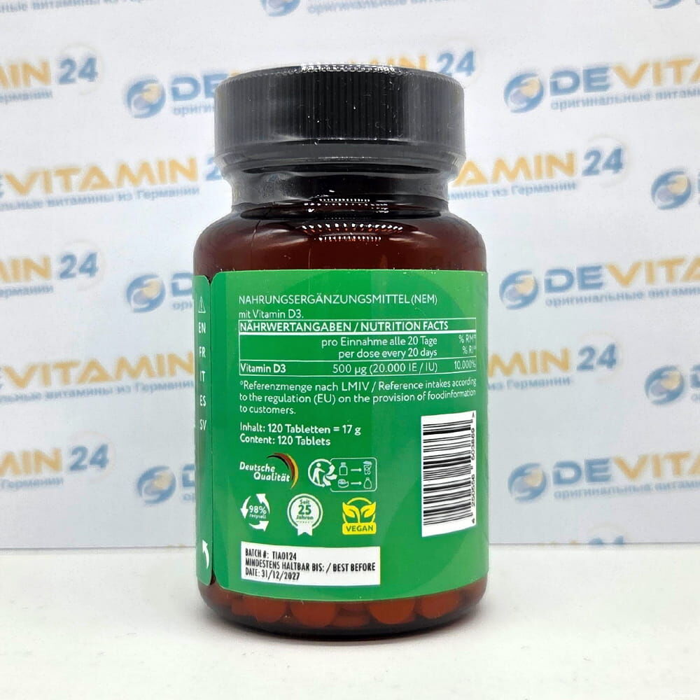 Это жирорастворимый витамин, поэтому он может накапливаться в жировой ткани. После тщательных и долгосрочных исследований мы теперь можем предложить нашим клиентам высококонцентрированный, биодоступный и полностью веганский витамин D3: одна таблетка содержит 20 000 МЕ этого мощного витамина! Наш витамин D3 обладает выраженным депо-эффектом. В этом преимущество высококонцентрированных таблеток витамина D3: после их приема запас этого необходимого витамина гарантирован примерно на три недели — даже в дни с небольшим количеством солнечного света.